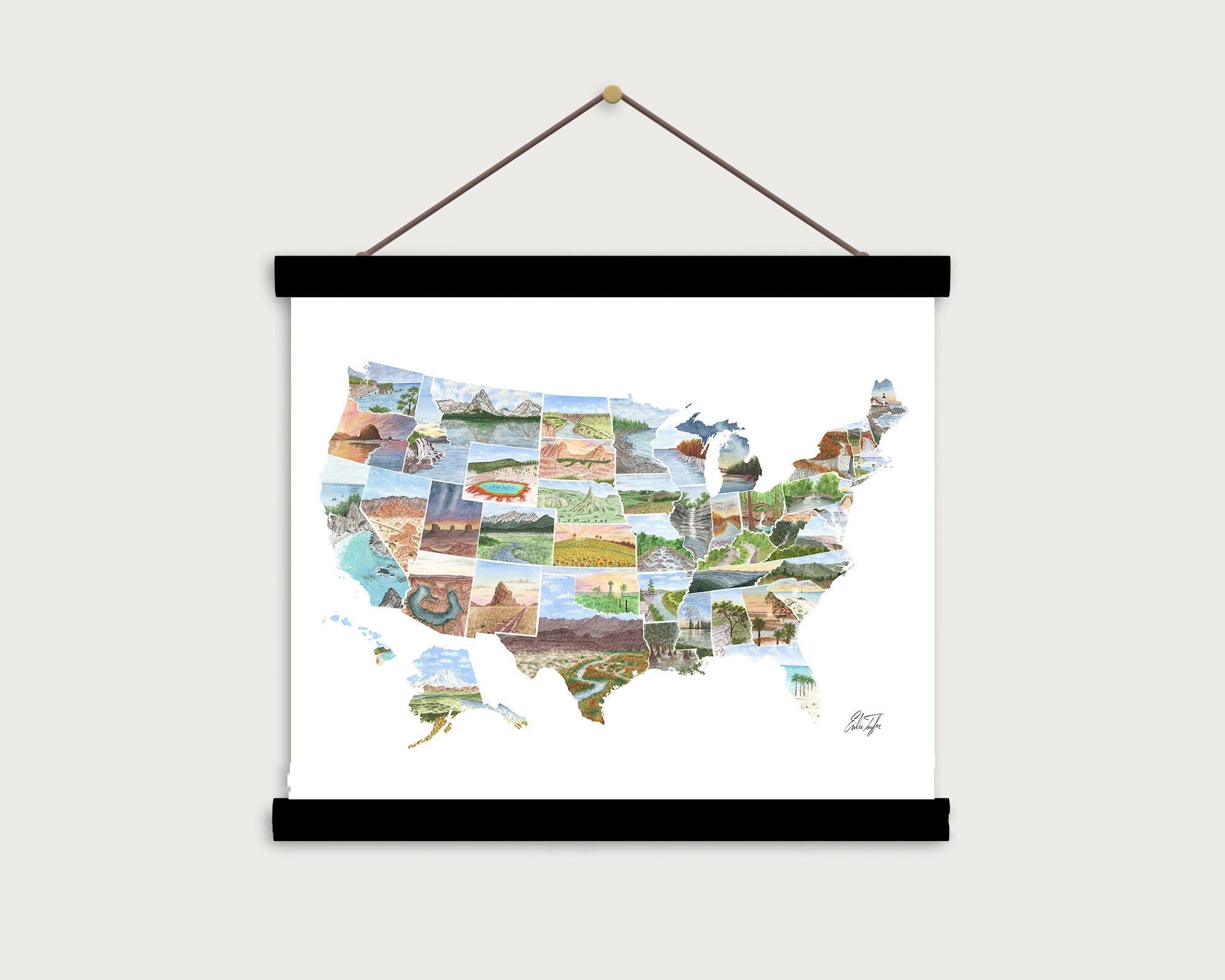 US Watercolor Map, US travel map, USA Painting, US Map with States paintings