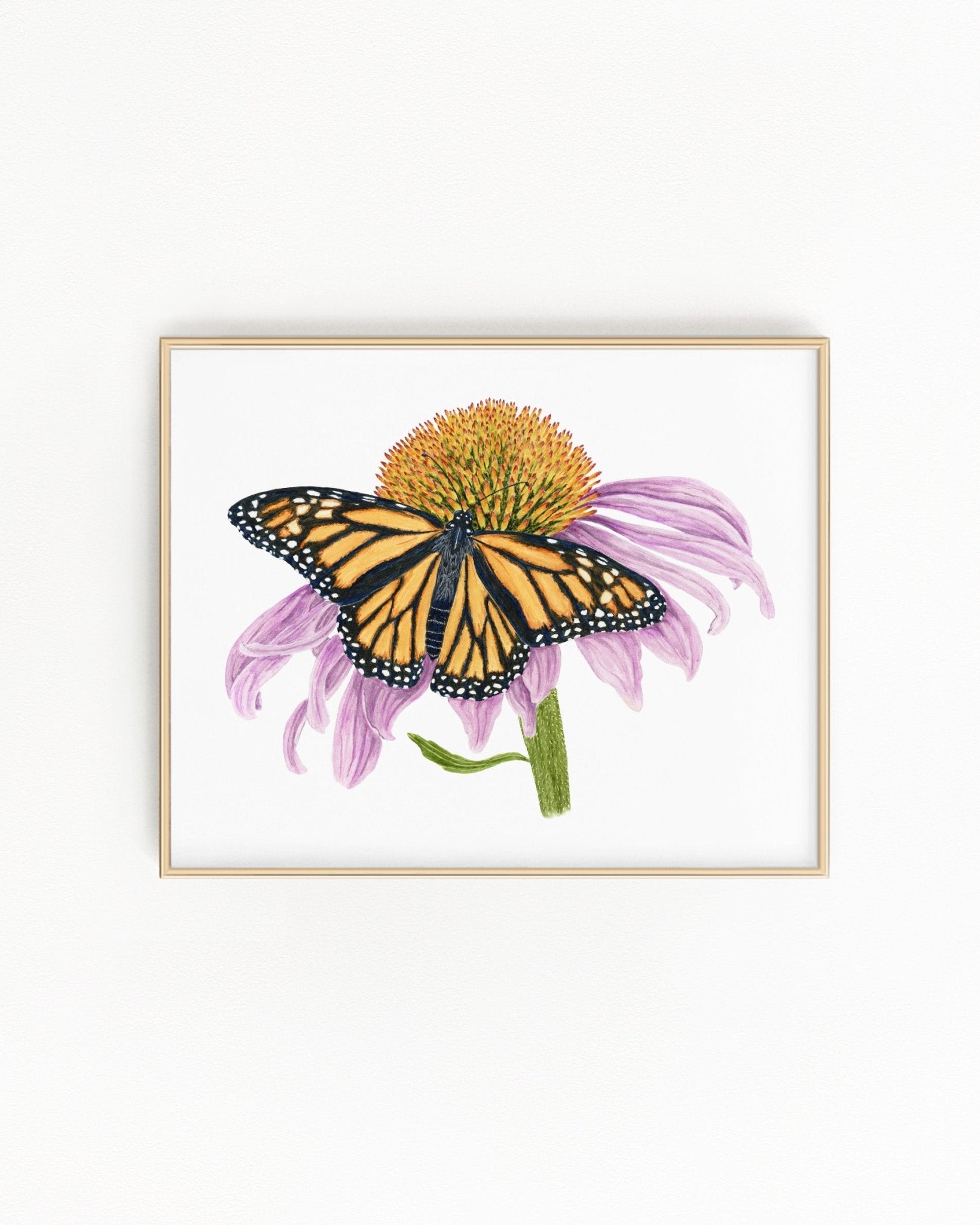 Monarch and Cone Flower Print | Watercolor Monarch Painting