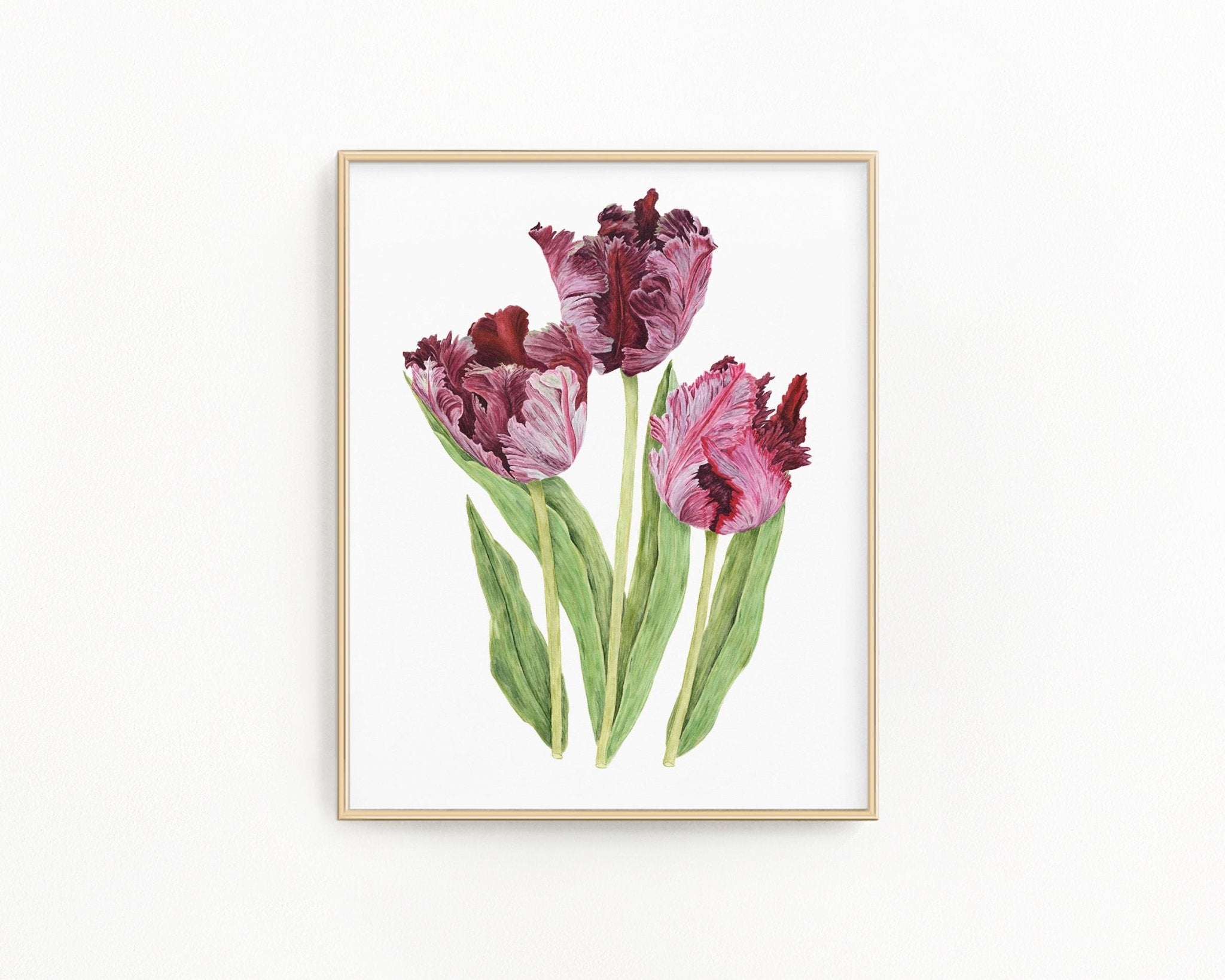Tulips Black Parrot Print| Watercolor Tulips Painting, Black Parrot Tulips