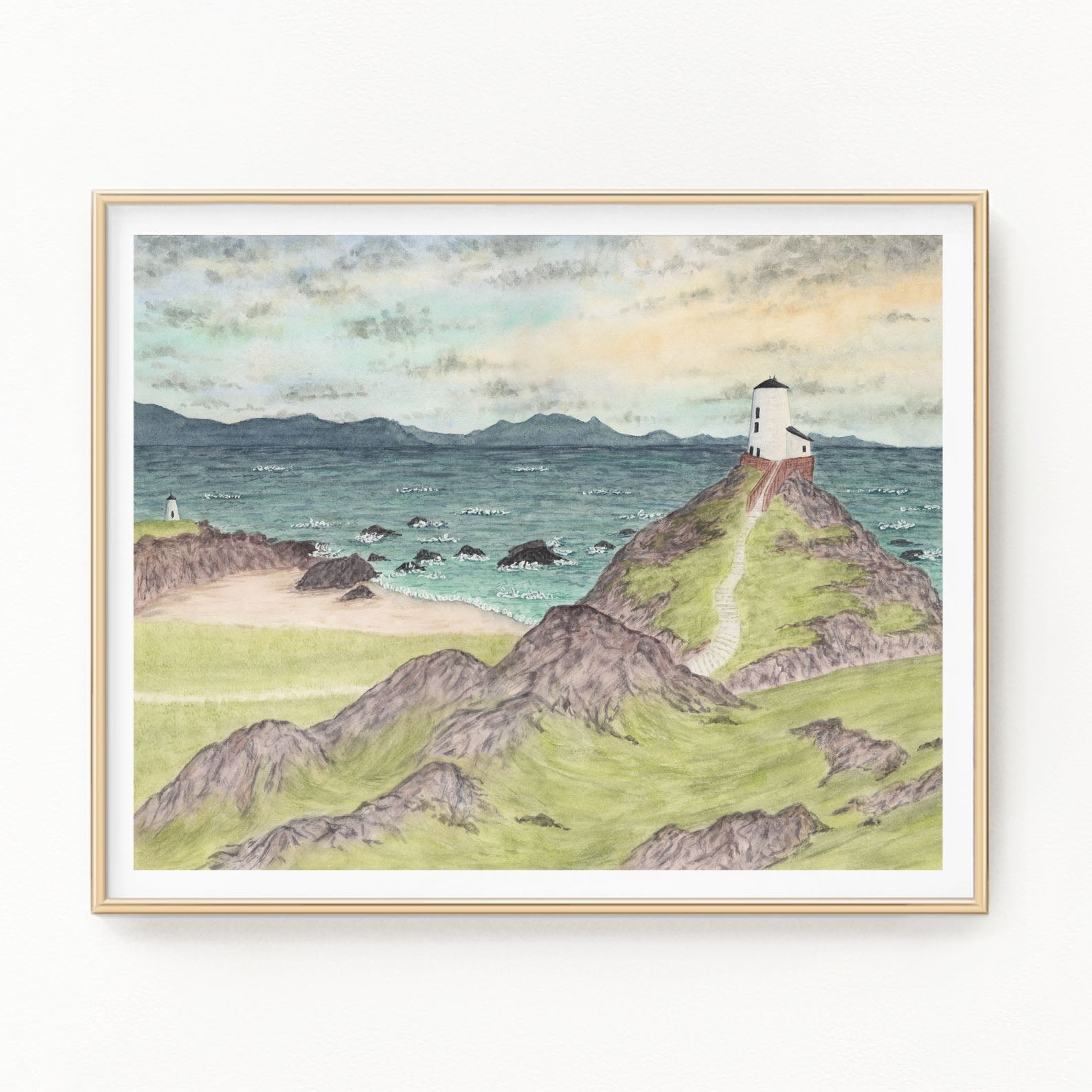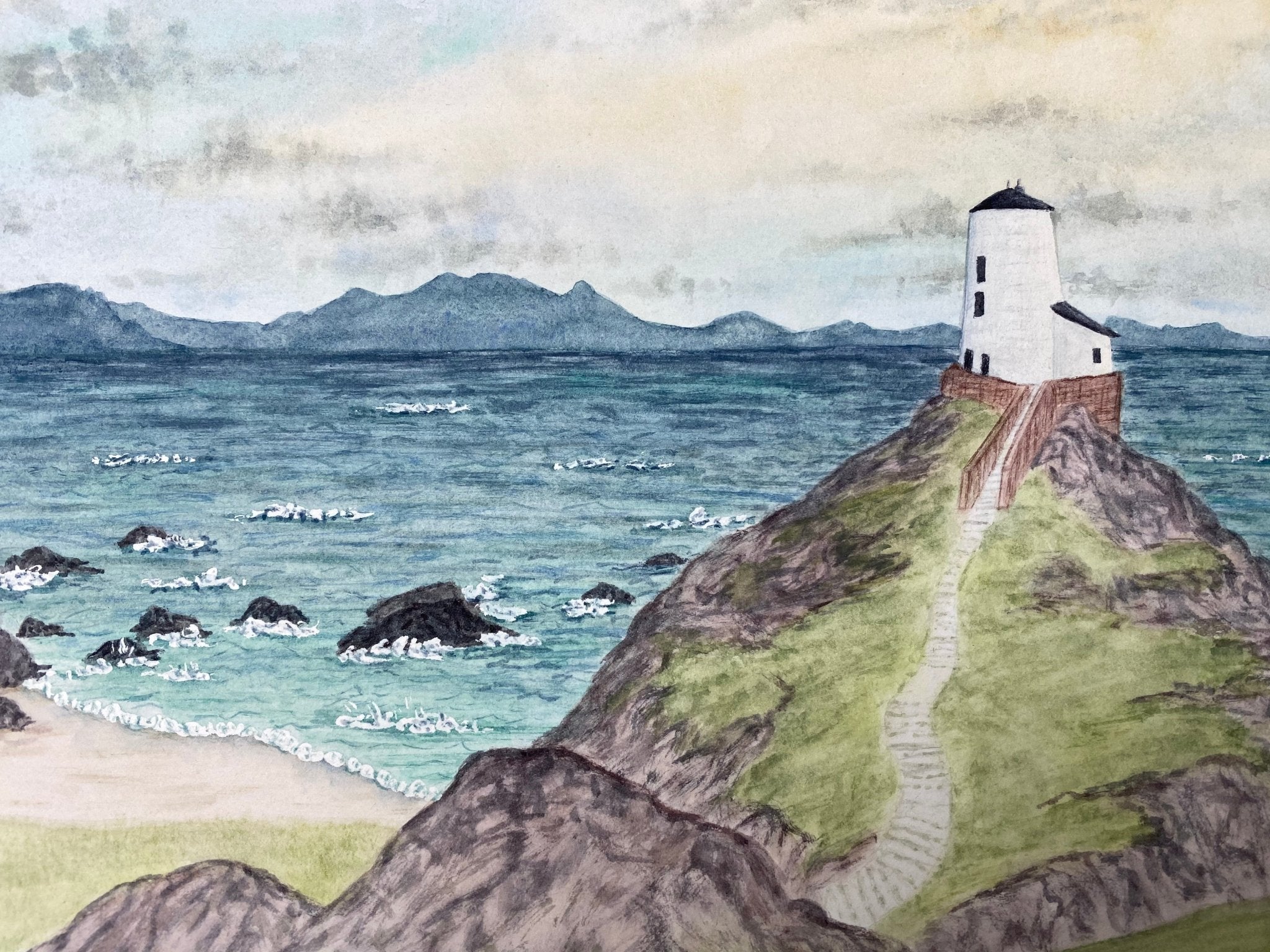 Day Beacons gets it's Landscape inspiration from a photograph by Jim Cooke I originally just loved the sky and the composition with the lighthouse. But as I went to paint I realized this wasn't a lighthouse but a Day Beacon, used before lighthouses to guide ships. The big beacon Twr Mawr sits on Llandwyn Island with its little brother Twr Bach. I love learning the history behind them and the idea of them shinning in the day.