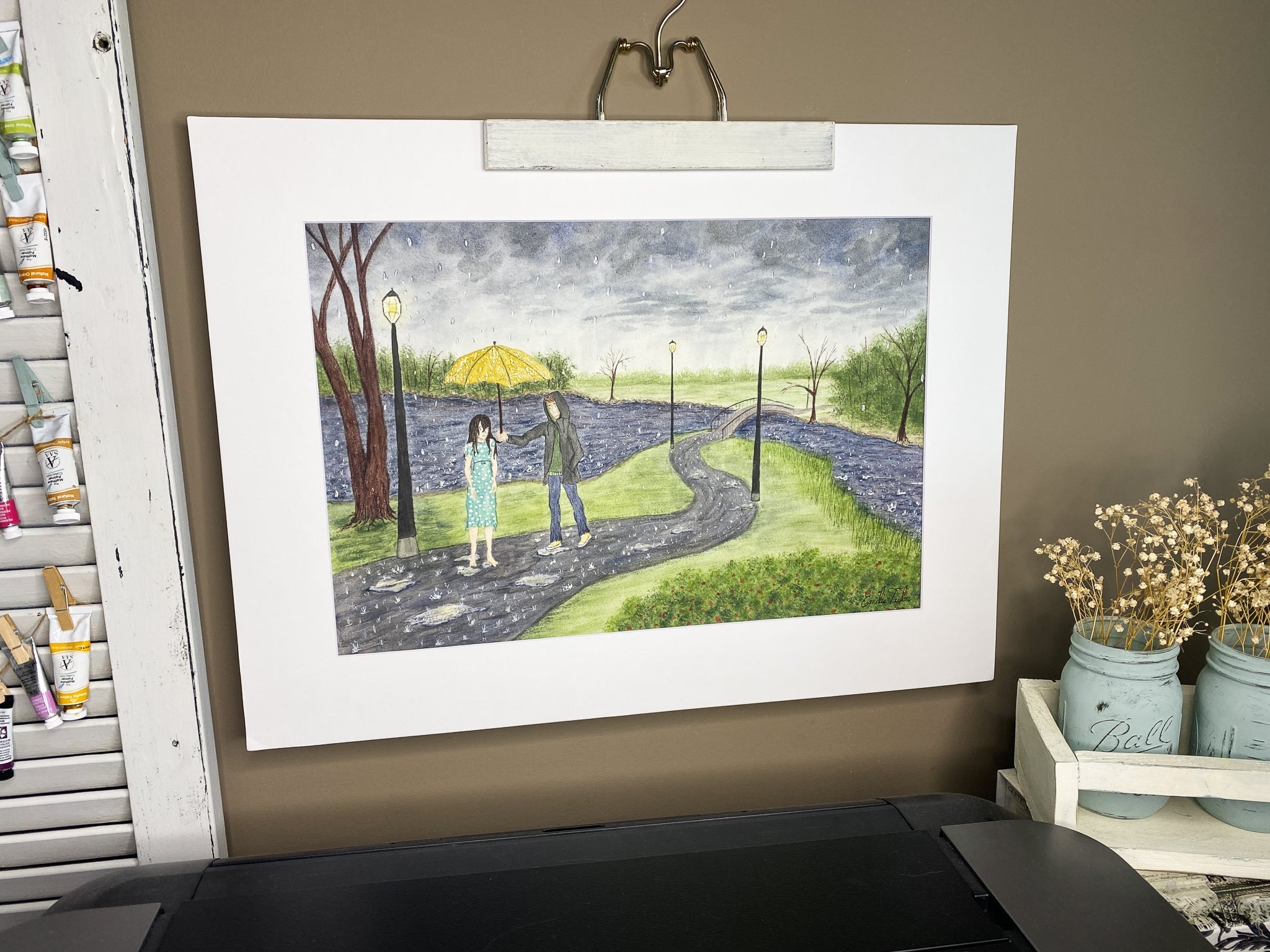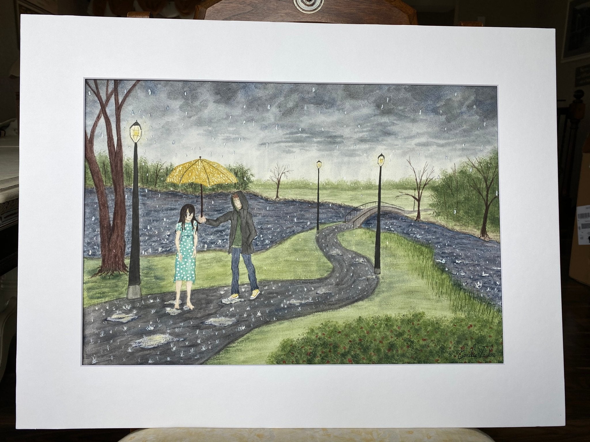 The very first of this took shape in my head as just the people, Someone offering an umbrella to a friend that’s in a hard place. But I don’t draw people and I had no idea if they could even convey the emotions I wanted. So enlisted a partner. My sister Elizabeth was kind enough to lend her help even when I was a bit picky! It was cool to watch my project take its first shape in her hands and become a piece of her heart too.