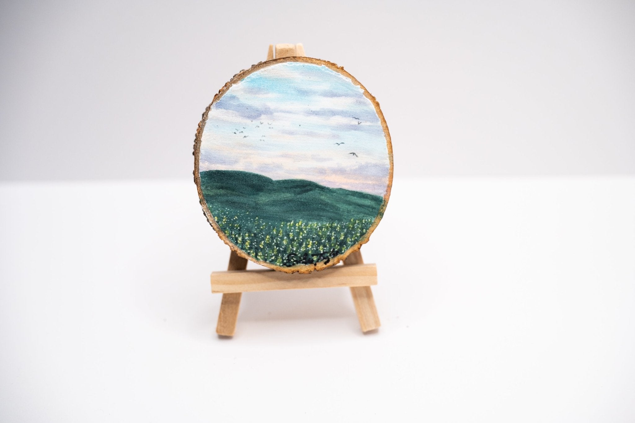 Float back hanging is the new standard but we can add a string loop to hang the old way. All check out the easel listing to add on an easel Mini size only for shelf and desktop display.