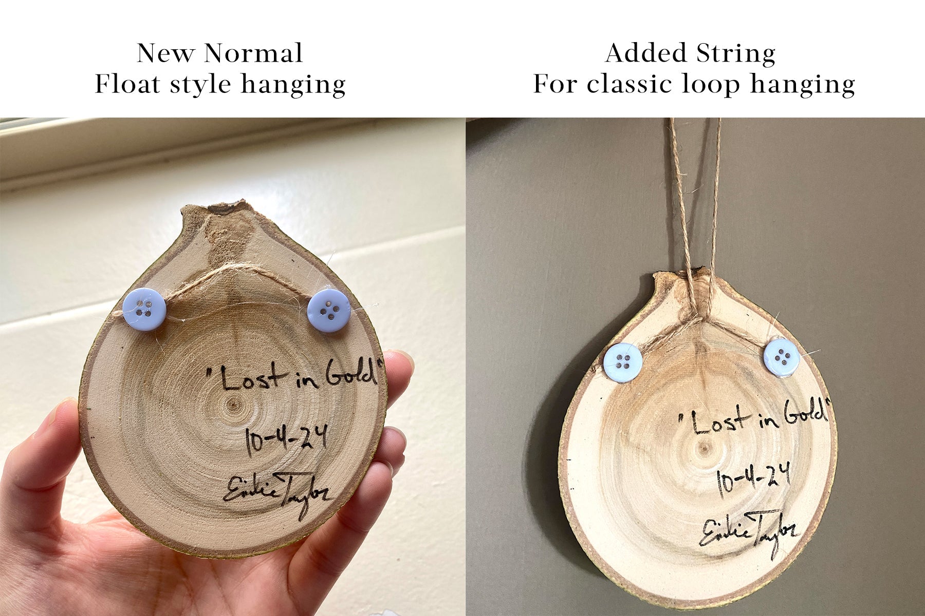 Float back hanging is the new standard but we can add a string loop to hang the old way. (Please leave a note if you want that) Also, check out the easel listing to add on an easel Mini size only for shelf and desktop display.