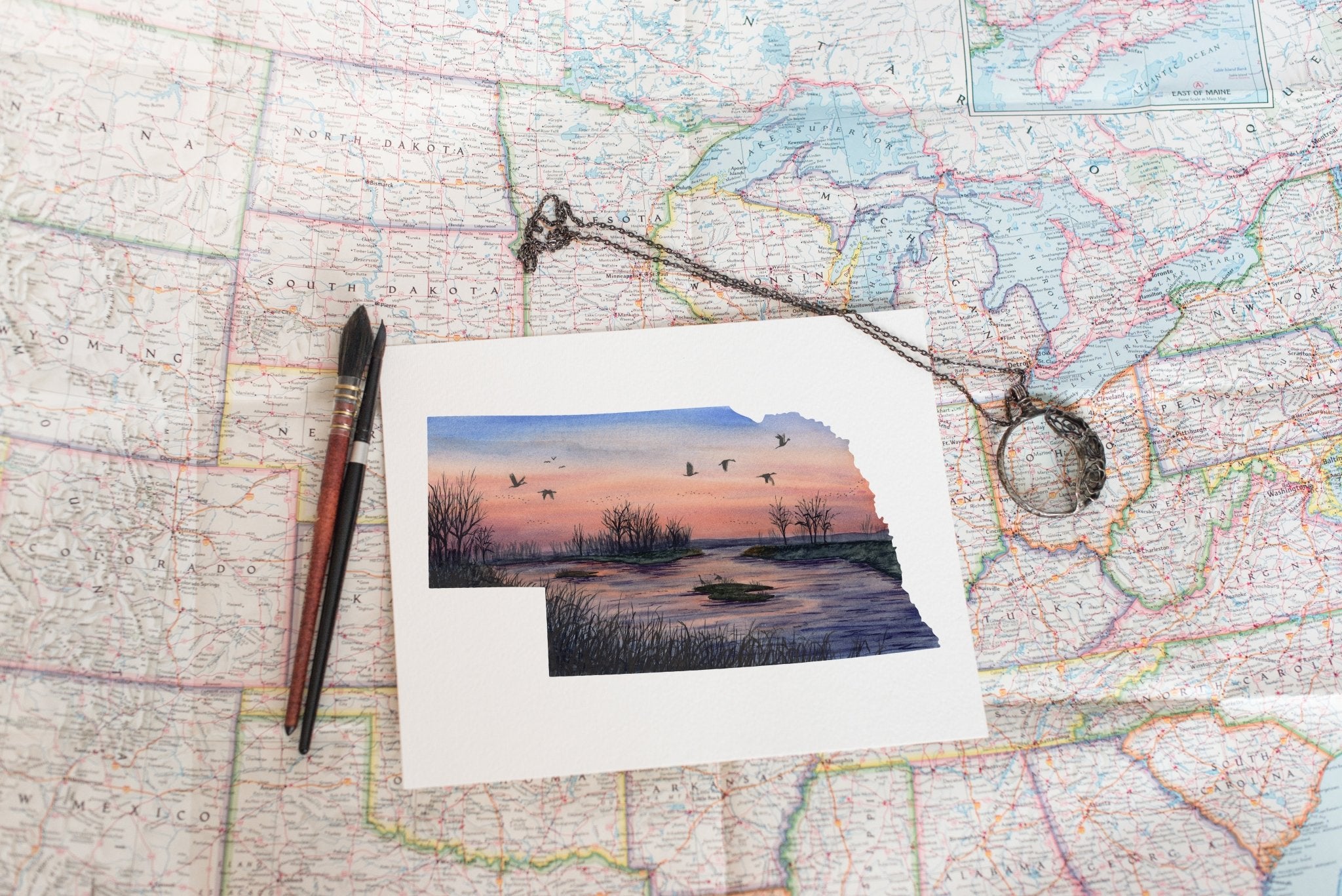 Nebraska Platte River Watercolor Painting, Nebraska State, Nebraska Map Art, Nebraska Poster